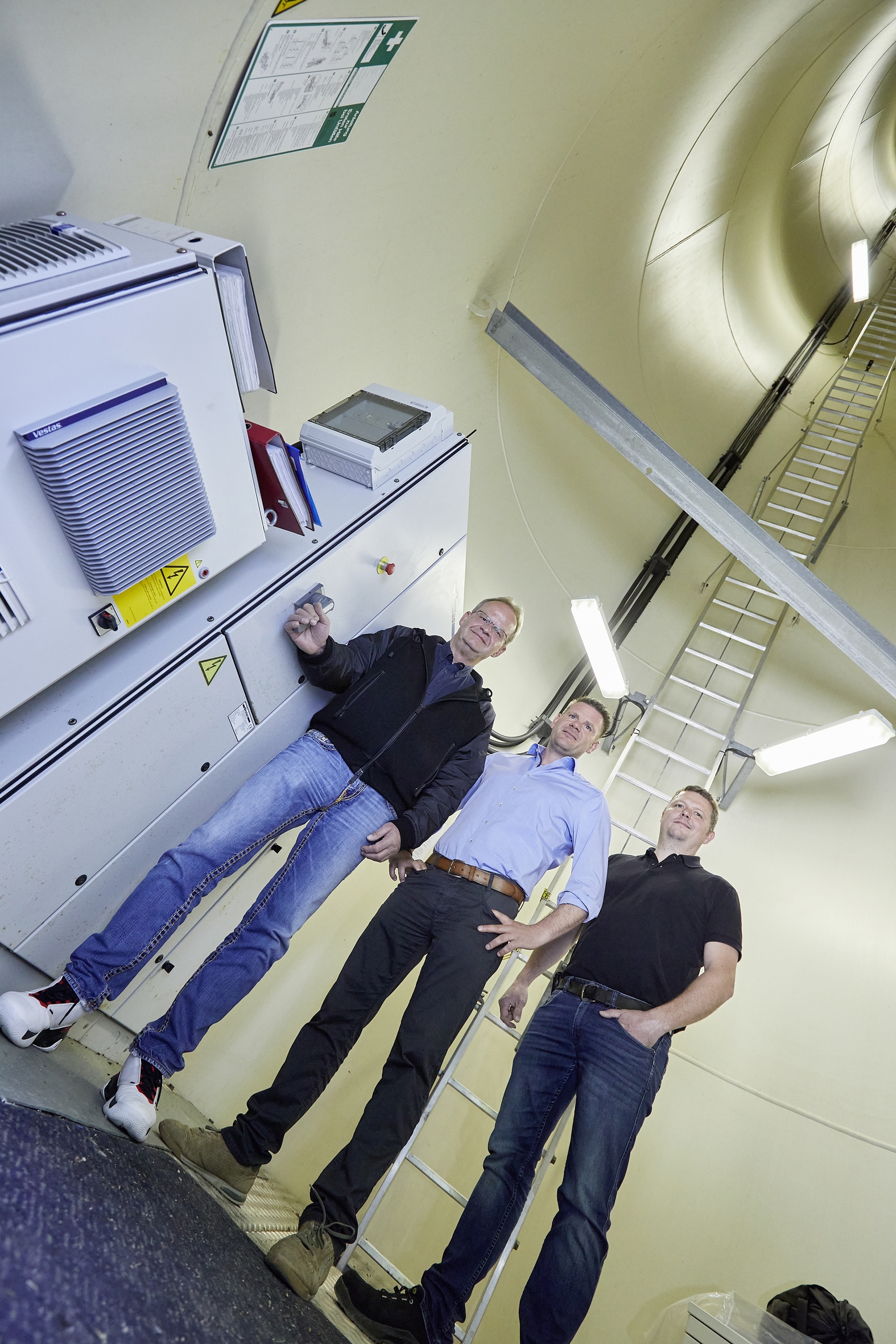 The wind turbines not only provide additional electricity for Arburg, but also offer exciting insights into the technology of these behemoths that tower 99 metres into the Black Forest sky. The simple explanation for this height is that wind must have a certain strength in order to generate electricity at all. So the higher the wind turbine, the stronger the wind blows on top. Under normal conditions, the tips of the 26-metre-long rotor blades, which cover a total of 2,124 square metres, reach a top speed of 200 kilometres per hour. To prevent the turbine from self-destructing through excessive rotation, the blades always rotate in a way that stops them from becoming too fast in the first place. They reach a maximum of 31.4 revolutions per minute. The control technology and generator are located in a nacelle the size of a standard car garage.